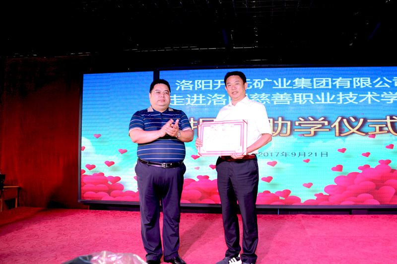 集團(tuán)副總經(jīng)理?xiàng)畲荷砺尻栭_元礦業(yè)集團(tuán)向洛陽慈善職業(yè)技術(shù)學(xué)校捐贈(zèng)新生校服西裝,洛陽慈善職業(yè)技術(shù)學(xué)校賈國(guó)彪校長(zhǎng)為洛陽開元礦業(yè)集團(tuán)有限公司頒發(fā)榮譽(yù)證書,并向全校師生展示新校服。