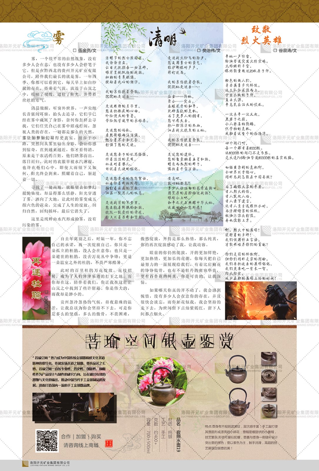 洛陽(yáng)開元礦業(yè)集團(tuán)有限公司簡(jiǎn)介洛陽(yáng)開元礦業(yè)集團(tuán)有限公司,始成立于2006年,位于洛陽(yáng)市開元大道269號(hào)。集團(tuán)旗下共有十余家全資子公司,業(yè)務(wù)涉及有色金屬礦山開發(fā)、礦產(chǎn)品購(gòu)銷與進(jìn)出口貿(mào)易、房地產(chǎn)開發(fā)、文化藝術(shù)、企業(yè)管理與咨詢、資本投資等多個(gè)領(lǐng)域。2024年,集團(tuán)公司銷售總額達(dá)7.8億元。民建河南省委委員、民建河南省委企業(yè)委副主任、民建洛陽(yáng)市委委員、企業(yè)委主任、洛陽(yáng)民建企業(yè)家協(xié)會(huì)會(huì)長(zhǎng)許明月是公司創(chuàng)始人,現(xiàn)任洛陽(yáng)開元礦業(yè)集團(tuán)有限公司董事長(zhǎng)。在礦業(yè)領(lǐng)域,洛陽(yáng)開元礦業(yè)集團(tuán)擁有多家實(shí)力雄厚的子公司:貴州開元礦業(yè)有限公司探、采礦權(quán)面積共11.33平方公里;興??h銅鑫礦業(yè)有限公司探礦權(quán)面積8.76平方公里,礦山資源潛力巨大;2021年,開元集團(tuán)與盧氏中科礦業(yè)有限公司開展戰(zhàn)略合作。盧氏中科礦業(yè)有限公司專注于有色金屬的浮選、加工和銷售,擁有強(qiáng)大的技術(shù)支撐平臺(tái),是集探、采、選、冶、研為一體的中大型綜合礦業(yè)企業(yè)。目前,盧氏中科王家河1000噸選礦廠已成功投產(chǎn),雙河金礦、柳關(guān)欒盧鉛鋅礦相繼順利開工,樓房銀礦與圪老灣鉛鋅礦的深部探礦重大突破,標(biāo)志著礦山版圖取得重大進(jìn)展,為開元集團(tuán)后續(xù)發(fā)展奠定了堅(jiān)實(shí)基礎(chǔ)。在文化傳媒領(lǐng)域,洛陽(yáng)市明月美術(shù)館通過豐富多樣的藝術(shù)展覽、學(xué)術(shù)研討和公共教育活動(dòng),努力打造一個(gè)集展覽、交流、教育、研究為一體的綜合性藝術(shù)平臺(tái)。此外,在金融投資領(lǐng)域,開元集團(tuán)旗下的北京明峰資本管理有限公司專注于投資具有高增長(zhǎng)潛力的優(yōu)秀企業(yè),特別是高科技、新能源、環(huán)保等新興產(chǎn)業(yè),為客戶提供個(gè)性化的資產(chǎn)配置服務(wù)。在做好企業(yè)經(jīng)營(yíng)的同時(shí),開元集團(tuán)始終不忘企業(yè)的社會(huì)責(zé)任和家國(guó)情懷,以突出的愛心公益事跡,開展了一系列公益慈善活動(dòng):“民建林”公益事業(yè)通過“思源基金”“幫幫公益”線上公益平臺(tái),與眾多愛心人士籌措資金20余萬元;資助541名貧困大學(xué)生共計(jì)270余萬元,推進(jìn)“數(shù)字助力——河南AI人才培養(yǎng)”;捐款10萬元,馳援京津冀、黑龍江洪水地質(zhì)災(zāi)害……公司于2017年底被洛陽(yáng)市慈善總會(huì)評(píng)為“洛陽(yáng)慈善風(fēng)云榜——十大愛心集體”。洛陽(yáng)開元礦業(yè)集團(tuán)有限公司秉承持續(xù)發(fā)展理念,憑借多年來良好的企業(yè)信譽(yù)與經(jīng)營(yíng)業(yè)績(jī),與全國(guó)多家企業(yè)建立了良好合作關(guān)系,受到社會(huì)各界的一致好評(píng),多次榮獲“納稅標(biāo)兵”“先進(jìn)企業(yè)”“招商引資模范企業(yè)”等榮譽(yù)稱號(hào)?;赝麃頃r(shí)路,開元人勠力同心,以“闖”的精神和“創(chuàng)”的勁頭,一路披荊斬棘,踏過千山萬水;展望新未來,開元人凝心聚力,不執(zhí)于“舊”,無畏于“新”,秉承“勇于跨越,追求卓越”的企業(yè)精神,乘著國(guó)家高質(zhì)量發(fā)展新征程的東風(fēng),跨過高山,越過大海,向著集團(tuán)多元化、國(guó)際化的目標(biāo),逐夢(mèng)遠(yuǎn)航,跨越前行!