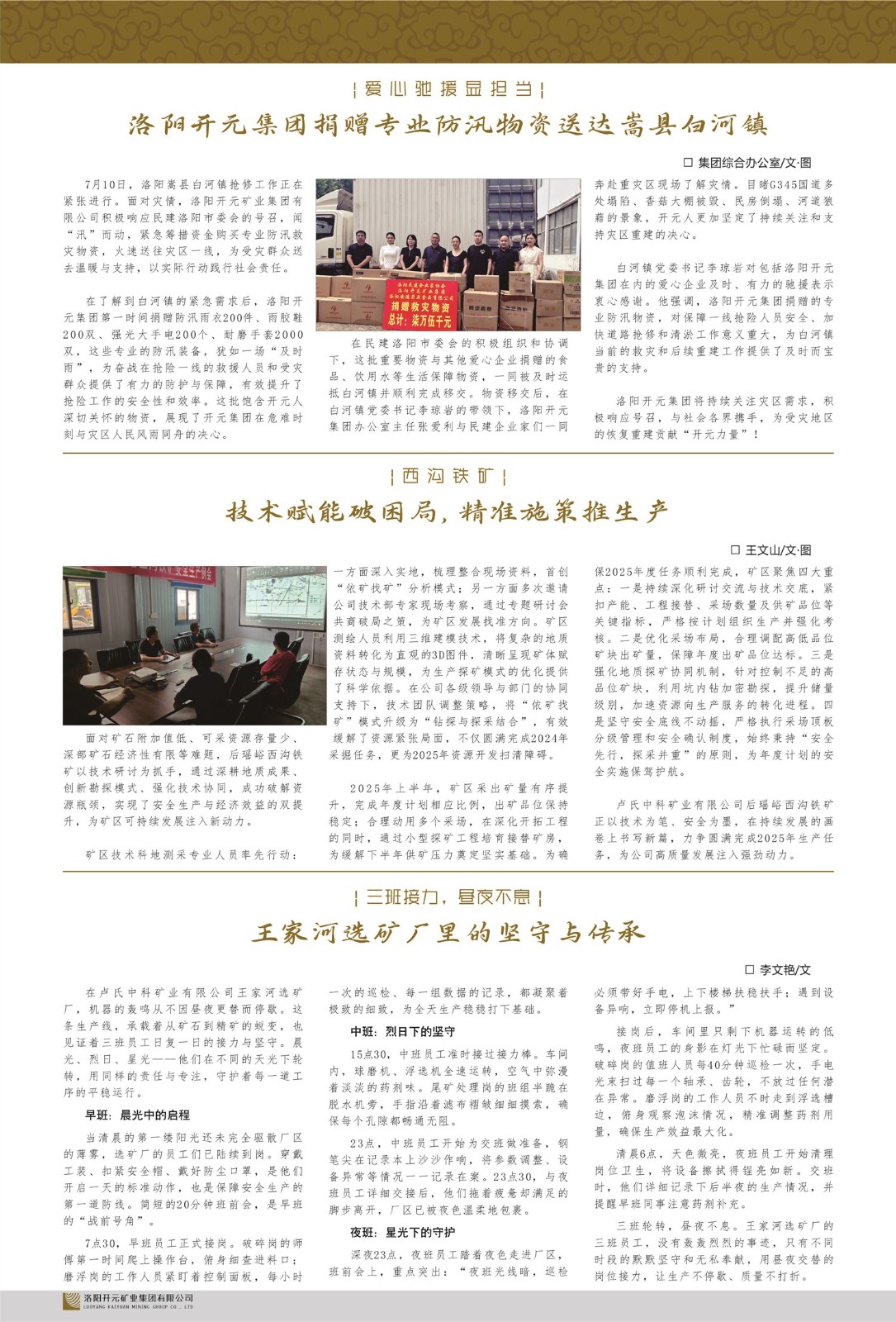 洛陽開元礦業(yè)集團有限公司簡介洛陽開元礦業(yè)集團有限公司,始成立于2006年,位于洛陽市開元大道269號。集團旗下共有十余家全資子公司,業(yè)務涉及有色金屬礦山開發(fā)、礦產(chǎn)品購銷與進出口貿(mào)易、房地產(chǎn)開發(fā)、文化藝術、企業(yè)管理與咨詢、資本投資等多個領域。2024年,集團公司銷售總額達7.8億元。民建河南省委委員、民建河南省委企業(yè)委副主任、民建洛陽市委委員、企業(yè)委主任、洛陽民建企業(yè)家協(xié)會會長許明月是公司創(chuàng)始人,現(xiàn)任洛陽開元礦業(yè)集團有限公司董事長。在礦業(yè)領域,洛陽開元礦業(yè)集團擁有多家實力雄厚的子公司:貴州開元礦業(yè)有限公司探、采礦權(quán)面積共11.33平方公里;興海縣銅鑫礦業(yè)有限公司探礦權(quán)面積8.76平方公里,礦山資源潛力巨大;2021年,開元集團與盧氏中科礦業(yè)有限公司開展戰(zhàn)略合作。盧氏中科礦業(yè)有限公司專注于有色金屬的浮選、加工和銷售,擁有強大的技術支撐平臺,是集探、采、選、冶、研為一體的中大型綜合礦業(yè)企業(yè)。目前,盧氏中科王家河1000噸選礦廠已成功投產(chǎn),雙河金礦、柳關欒盧鉛鋅礦相繼順利開工,樓房銀礦與圪老灣鉛鋅礦的深部探礦重大突破,標志著礦山版圖取得重大進展,為開元集團后續(xù)發(fā)展奠定了堅實基礎。在文化傳媒領域,洛陽市明月美術館通過豐富多樣的藝術展覽、學術研討和公共教育活動,努力打造一個集展覽、交流、教育、研究為一體的綜合性藝術平臺。此外,在金融投資領域,開元集團旗下的北京明峰資本管理有限公司專注于投資具有高增長潛力的優(yōu)秀企業(yè),特別是高科技、新能源、環(huán)保等新興產(chǎn)業(yè),為客戶提供個性化的資產(chǎn)配置服務。在做好企業(yè)經(jīng)營的同時,開元集團始終不忘企業(yè)的社會責任和家國情懷,以突出的愛心公益事跡,開展了一系列公益慈善活動:“民建林”公益事業(yè)通過“思源基金”“幫幫公益”線上公益平臺,與眾多愛心人士籌措資金20余萬元;資助541名貧困大學生共計270余萬元,推進“數(shù)字助力——河南AI人才培養(yǎng)”;捐款10萬元,馳援京津冀、黑龍江洪水地質(zhì)災害……公司于2017年底被洛陽市慈善總會評為“洛陽慈善風云榜——十大愛心集體”。洛陽開元礦業(yè)集團有限公司秉承持續(xù)發(fā)展理念,憑借多年來良好的企業(yè)信譽與經(jīng)營業(yè)績,與全國多家企業(yè)建立了良好合作關系,受到社會各界的一致好評,多次榮獲“納稅標兵”“先進企業(yè)”“招商引資模范企業(yè)”等榮譽稱號。回望來時路,開元人勠力同心,以“闖”的精神和“創(chuàng)”的勁頭,一路披荊斬棘,踏過千山萬水;展望新未來,開元人凝心聚力,不執(zhí)于“舊”,無畏于“新”,秉承“勇于跨越,追求卓越”的企業(yè)精神,乘著國家高質(zhì)量發(fā)展新征程的東風,跨過高山,越過大海,向著集團多元化、國際化的目標,逐夢遠航,跨越前行!